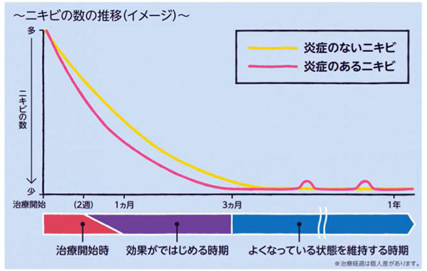 使い始めてから1ヶ月程度で明らかに大幅にニキビが減少していき、3ヶ月を目安にかなり改善ができるといった経過を辿る人が多いです。