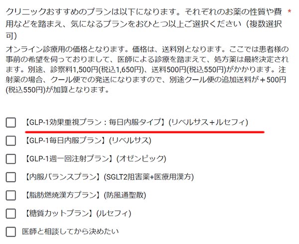 最初からGLP-1効果重視プランというのが用意されていて、リベルサス+ルセフィのセットを1ヵ月分で24,310円で処方してもらう事ができます。